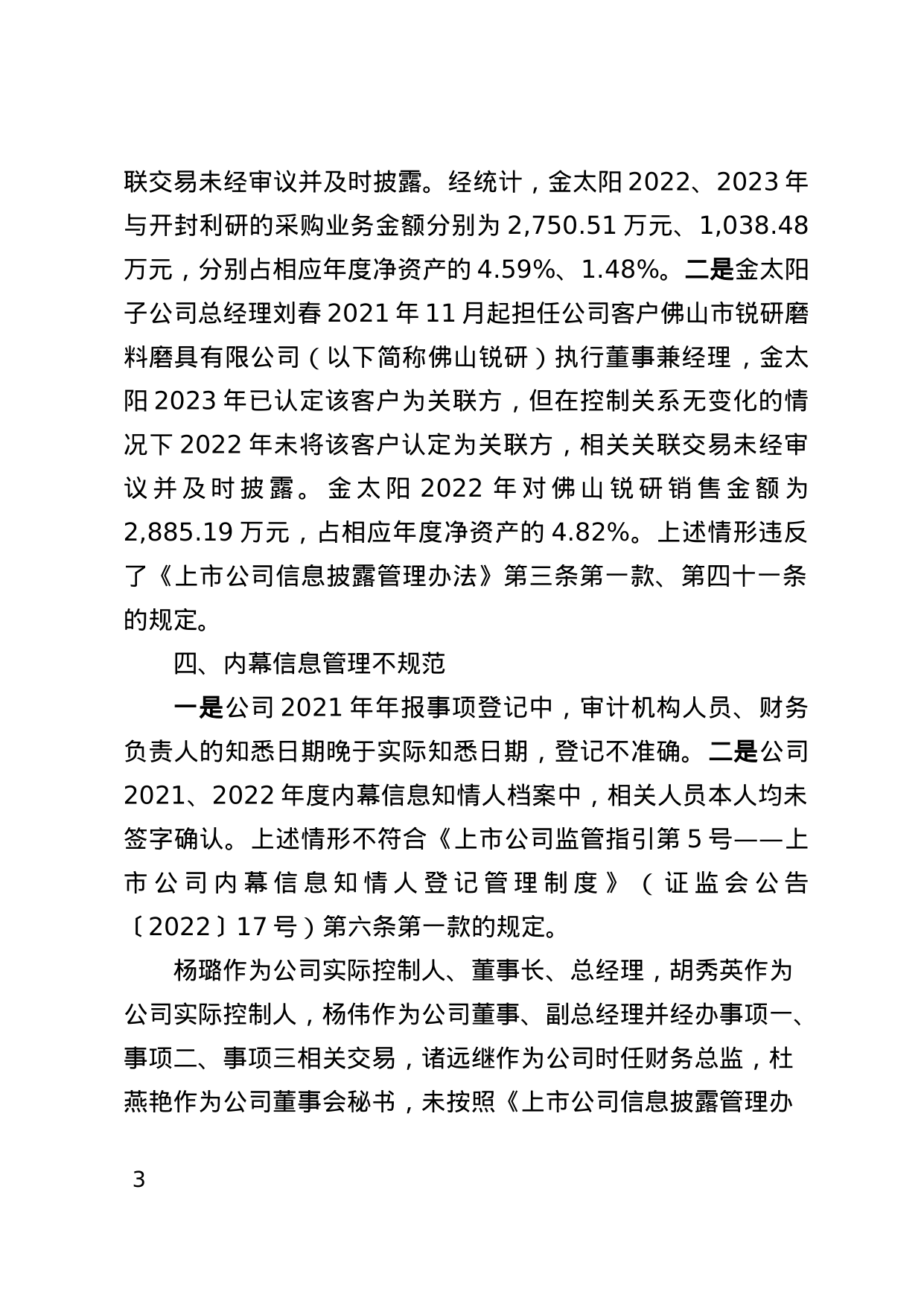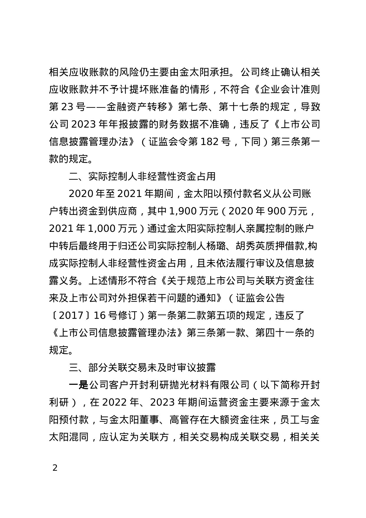 决定书显示,东莞金太阳研磨股份有限公司存在以下问题:应收账款核算不准确,坏账计提不充分;实际控制人非经营性资金占用;部分关联交易未及时审议披露;内幕信息管理不规范。